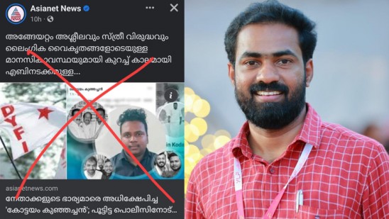 എന്നാൽ ഇതു സംബന്ധിച്ച വാർത്ത ഏഷ്യാനെറ്റ് ന്യൂസ് ഓൺലൈൻ ഹാന്റിൽ റിപ്പോർട്ട് ചെയ്തത്, ഈ ക്രിമിനൽ ഡിവൈഎഫ്ഐ പ്രവർത്തകനാണെന്ന് തോന്നിപ്പിക്കുന്ന നിലയിലാണ്. ഡിവൈഎഫ്ഐ പതാക ഒരു ഭാഗത്തും പ്രതിയുടെ മുഖം മറുപകുതിയിലും ചേർത്ത കാർഡിൽ ഈ ക്രിമിനൽ കോൺഗ്രസ്സുകാരനാണെന്ന ഒരു സൂചന പോലും വരാതിരിക്കാൻ ഏഷ്യാനെറ്റ് പുലർത്തിയ ജാഗ്രതയുണ്ടല്ലോ, അത് കാണാതെ പോകാൻ പറ്റില്ല. കോൺഗ്രസ്സ് സൈബർ ക്രിമിനലുകളെ സംരക്ഷിക്കുന്ന രീതിയിൽ പ്രചരിപ്പിക്കപ്പെടാൻ പാകത്തിന് കാർഡ് ഡിസൈൻ കൊടുക്കുന്ന പണിയാണ് ഏഷ്യാനെറ്റ് ന്യൂസ് ചെയ്തു കൊടുത്തത്.