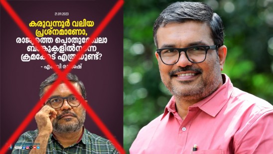 കരിവന്നൂർ തട്ടിപ്പിനെ കുറച്ചുകാണുകയോ അതിനോട് വിട്ടുവീഴ്ച ചെയ്യുകയോ ഇല്ല. അതേസമയം പൊതുമേഖല ബാങ്കുകളിലടക്കം നടക്കുന്ന തട്ടിപ്പുകളിൽ കേന്ദ്ര ഏജൻസികൾക്ക് ഉത്സാഹമില്ലാത്തതിന്റെ രാഷ്ട്രീയം തുറന്നുകാട്ടുകയാണ് ചെയ്തത്. ജന്മഭൂമി ഓൺലൈനും മാതൃഭൂമി ഓൺലൈനും തമ്മിലുള്ള അന്തരം കുറഞ്ഞുവരുന്നു. അതേസമയം നൽകാത്ത വാർത്തയുടെ പേരിൽ മാതൃഭൂമി പത്രം കാർട്ടൂൺ നൽകി. അത് കാർട്ടൂണാണെന്ന് വരച്ചയാൾക്ക് അവകാശപ്പെടാനുള്ള സ്വാതന്ത്ര്യമുണ്ട്. ബിരിയാണി ചെമ്പ്, ഈത്തപ്പഴം തുടങ്ങി രചിച്ചക്കപ്പെട്ട പല കഥകളുടെയും അവസ്ഥ വലത് മാധ്യമങ്ങൾ അന്വേഷിക്കണം. കുരുക്ക് മുറുക്കി മാധ്യമങ്ങളുടെ കൈ തഴമ്പിച്ചതല്ലാതെ ഒന്നും സംഭവിച്ചിട്ടില്ല. പൊതുതെരഞ്ഞെടുപ്പിന് മുമ്പ് പുതിയ വില്ലൻന്മാരെയും ഇരകളെയുംമാധ്യമങ്ങൾക്ക് വേണം - എം ബി രാജേഷ് പറഞ്ഞു.