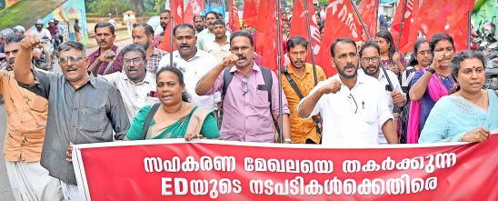 എൻഫോഴ്സ്മെന്റ് ഡയറക്ടറേറ്റിനെ ഉപയോഗിച്ച് സഹകരണ മേഖലയെ തകർക്കുന്ന കേന്ദ്രസർക്കാർ ഗൂഢാലോചനയിലും ഇഡിയുടെ അന്വേഷണത്തിന്റെ മറവിൽ ജീവനക്കാരെ മണിക്കൂറോളം തടഞ്ഞുവയ്ക്കുന്ന മനുഷ്യാവകാശ ലംഘനത്തിലും പ്രതിഷേധിച്ച് കേരള കോ–-ഓപ്പറേറ്റീവ് എംപ്ലോയീസ് യൂണിയൻ (സിഐടിയു) നേതൃത്വത്തിൽ നഗരത്തിൽ പ്രകടനവും യോഗവും നടത്തി. ജില്ലാ പ്രസിഡന്റ് എ എസ് അൻവർ ഉദ്ഘാടനംചെയ്തു. സംസ്ഥാന കമ്മിറ്റിയംഗം ബി എൽ ബാബു അധ്യക്ഷനായി. ജില്ലാ ജോയിന്റ് സെക്രട്ടറിമാരായ കെ ബി പ്രദീപ്, ടി എസ് ബൈജു, എ വി ജോജു, ജില്ലാ വൈസ് പ്രസിഡന്റ് എം വി അനിൽകുമാർ, ജില്ലാ കമ്മിറ്റിയംഗം ഇ എൻ അനിൽകുമാർ എന്നിവർ സംസാരിച്ചൂ.