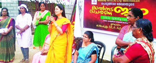 മിനി ദേവരാജൻ ജാഥാ ക്യാപ്റ്റനായി. എൻ ഇന്ദിരാദാസ്, സുകുമാരി തങ്കച്ചൻ എന്നിവർ സംസാരിച്ചു. കനാൽ ജങ്ഷനിൽനിന്ന് ആരംഭിച്ച ജാഥ കുറത്തികാട് ജങ്ഷനിൽ സമാപിച്ചു. തെക്കേക്കര പടിഞ്ഞാറ് മേഖലാ കമ്മിറ്റി സംഘടിപ്പിച്ച കാൽനട പ്രചാരണജാഥ ജില്ലാ കമ്മിറ്റിയംഗം അഡ്വ. എസ് സീമ ഉദ്ഘാടനംചെയ്തു. ഇന്ദിര വാസുദേവ് ജാഥാ ക്യാപ്റ്റനായി. ബിജി ഹരികുമാർ, തുളസീഭായി, ബെറ്റ്സി ജിനു എന്നിവർ സംസാരിച്ചു.