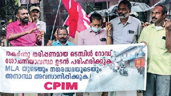 കുറച്ചുനാൾമുമ്പ് റോഡിന്റെ ഒരു ഭാഗത്ത് ടൈൽ വിരിച്ചെങ്കിലും അത് പൂർത്തിയാക്കിയില്ല. തകര്ന്ന റോഡില് കഴിഞ്ഞദിവസം നഗരസഭാ അധികൃതരുടെ അറിവോടെ മെറ്റൽപ്പൊടിയും ചെറിയ മെറ്റലും ഇട്ടു. പക്ഷേ, മഴ പെയ്തതോടെ റോഡില് ചെളി നിറഞ്ഞു. റോഡ് അറ്റകുറ്റപ്പണി നടത്താന് വി ഡി സതീശന് എംഎൽഎയും നഗരസഭയും ഇടപെടുന്നില്ലെന്ന് സിപിഐ എം ആരോപിച്ചു. ടൗൺ വെസ്റ്റ് ലോക്കൽ സെക്രട്ടറി സി പി ജയൻ, നഗരസഭാ കൗൺസിലർമാരായ ജ്യോതി ദിനേശൻ, ജയദേവാനന്ദൻ, എം കെ ബാനർജി, ഷൈനി രാധാകൃഷ്ണൻ, നിമിഷ ജിനേഷ്, ലോക്കൽ കമ്മിറ്റി അംഗങ്ങളായ പി കെ സുരേന്ദ്രൻ, എൻ എസ് സുനിൽകുമാർ എന്നിവർ സംസാരിച്ചു.