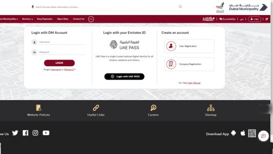 ദുബായ് മുനിസിപ്പാലിറ്റിയുടെ ഡിജിറ്റൽ പോർട്ടൽ വഴി ഉപഭോക്താക്കൾക്ക് അവരുടെ യുഎഇ പാസ് അക്കൗണ്ട് ഉപയോഗിച്ച് പുതിയ സേവനത്തിനായി രജിസ്റ്റർ ചെയ്യാം: https://hub.dm.gov.ae/openid/login?usertype=dm_external&locale=en