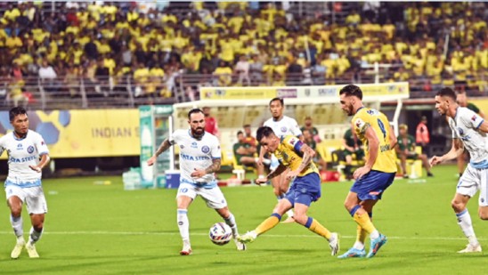 തുടക്കത്തിൽ മഴത്തണുപ്പ് കളിയൊഴുക്കിനെ ബാധിച്ചു. അലസമായ നീക്കങ്ങളായിരുന്നു ഇരുഭാഗത്തും. ബ്ലാസ്റ്റേഴ്സ് മധ്യനിരയിൽനിന്നുള്ള പാസുകളും ക്രോസുകളും മുന്നേറ്റക്കാരിലേക്കെത്താതെ വഴിതെറ്റി പറന്നു. ആദ്യപകുതി തീരുന്നതിന് തൊട്ടുമുമ്പാണ് കളിക്ക് അൽപ്പം ചൂടുപിടിച്ചത്. വലതുവശത്തുനിന്ന് പ്രബീർദാസിന്റെ ഒന്നാന്തരം ക്രോസ് ജംഷഡ്പുർ ഗോൾമുഖത്തേക്ക് പറന്നു. മുഹമ്മദ് അയ്മെൻ ചാടി ഉയർന്നെങ്കിലും താഴെവീണു. പന്ത് ഇടതുഭാഗത്ത് ലൂണയുടെ കാലിൽ. ഉറുഗ്വേക്കാരന്റെ മനോഹരമായ ഷോട്ട് ബാറിന് അരികിലൂടെ പറന്നു. ആദ്യപകുതി വിരസമായിത്തന്നെ അവസാനിച്ചു.